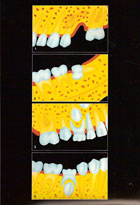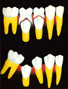 This illustration shows that when a tooth is removed the other teeth tend to drift towards the open space to fill the gap and so the dental arch collapse.. Spaces develop between teeth with resultant development of cavities and eventual loss of these teeth as well. Therefore it is important to have missing teeth replaced.